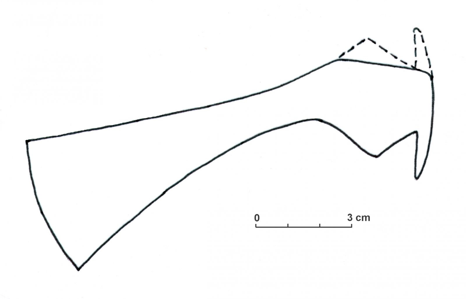 Ostrze toporka jest wąskie, proste, niemal symetryczne, bez wyodrębnionej brody, silnie wychylone ku dołowi. Wąska szyjka łączy ostrze z okrągłą w przekroju osadą, która w części dolnej i górnej posiadała wąsy i tzw. dolny kapturek. Niestety, stan zachowania zabytku uniemożliwia jednoznaczną odpowiedź, czy osada posiadała kapturek także w części górnej. Długość całkowita toporka to 12,5 cm, minimalna szerokość żeleźca to 1,1 cm a maksymalna 4,5 cm. Średnica osady wynosi 3,2 cm.